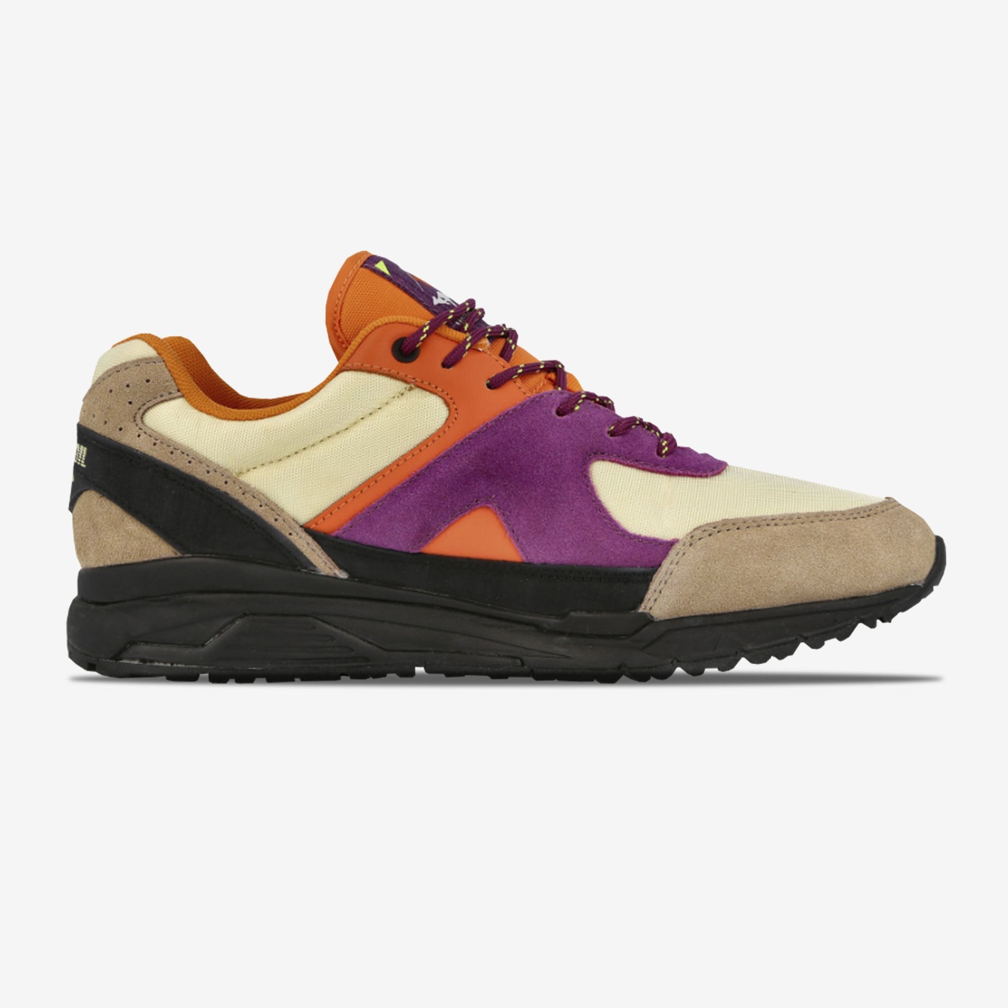 De KangaROOS Runaway is gemaakt van suede en textiel. De upper is gemaakt van mesh. De Runaway bestaat uit de kleuren beige met paars, oranje en zwart.