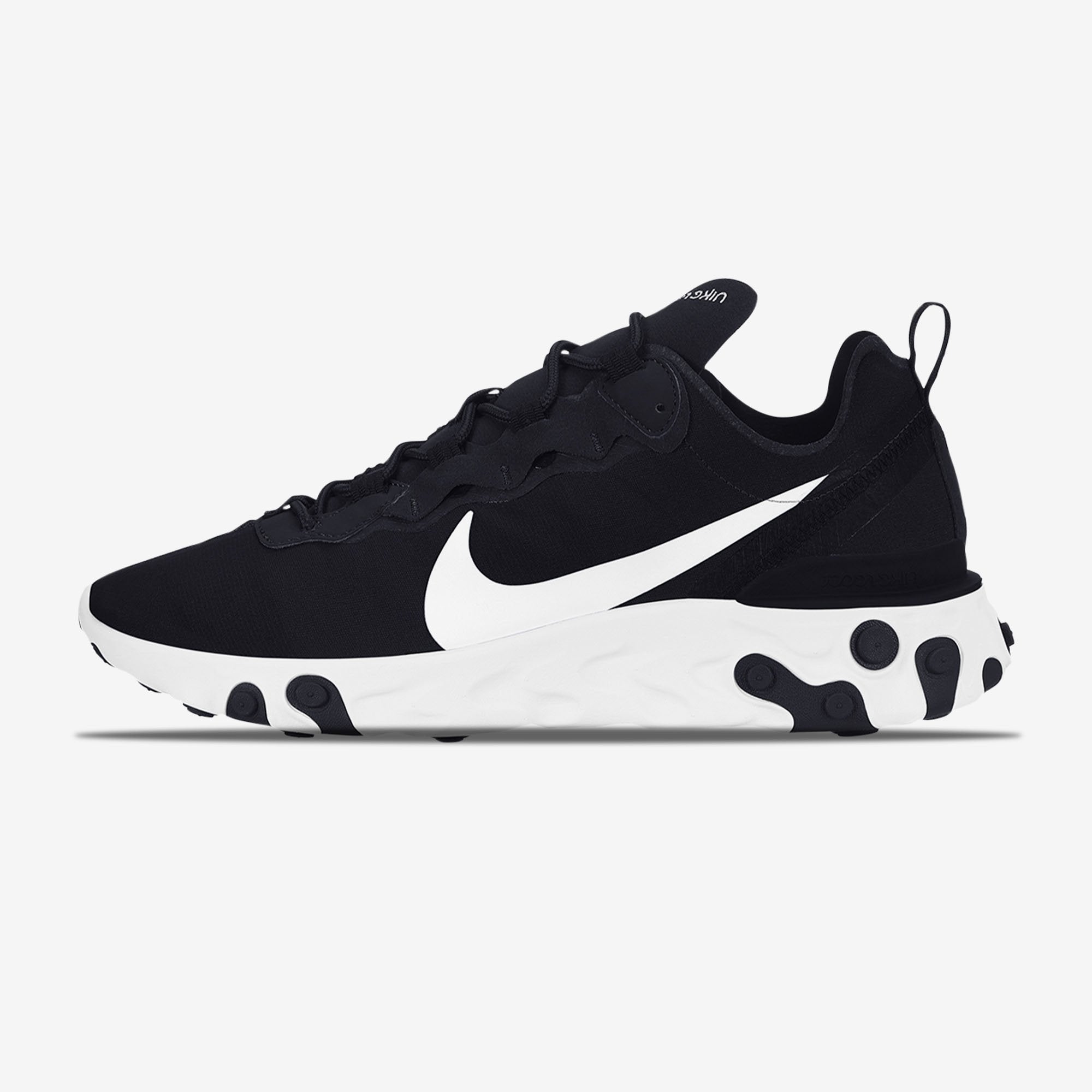 Deze React Element 55 heeft een upper van textiel dat is geconstrueerd in plaats van doorschijnend. Deze colorway heeft een zwarte upper met witte details op het vetersysteem, de swoosh, de upper en de zachte React-zool.