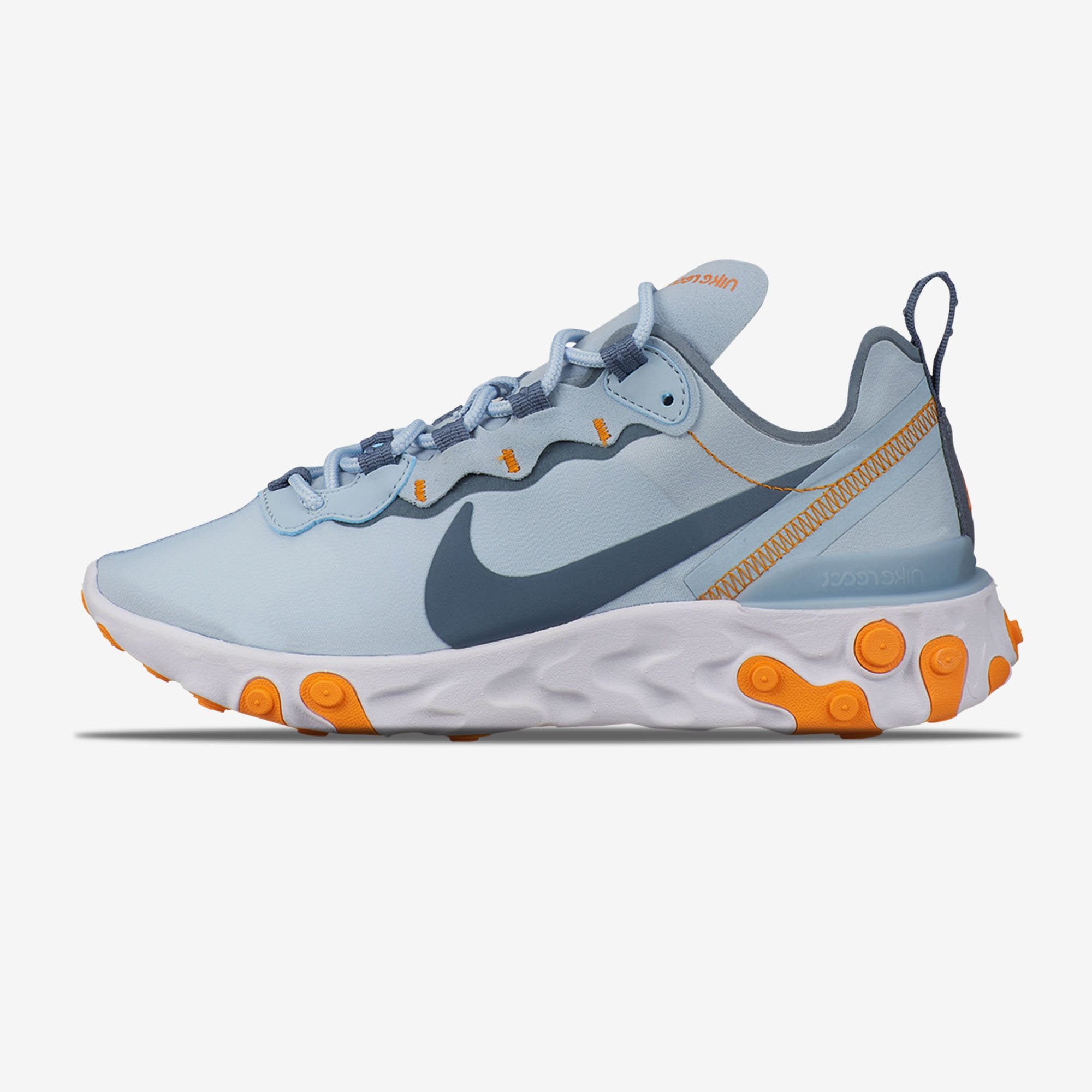 Deze Nike React Element 55 heeft een upper van textiel dat is geconstrueerd in plaats van doorschijnend. Deze colorway heeft een lichtblauwe upper met oranje en grijze details op het vetersysteem, de swoosh, de upper en de zachte React-zool.