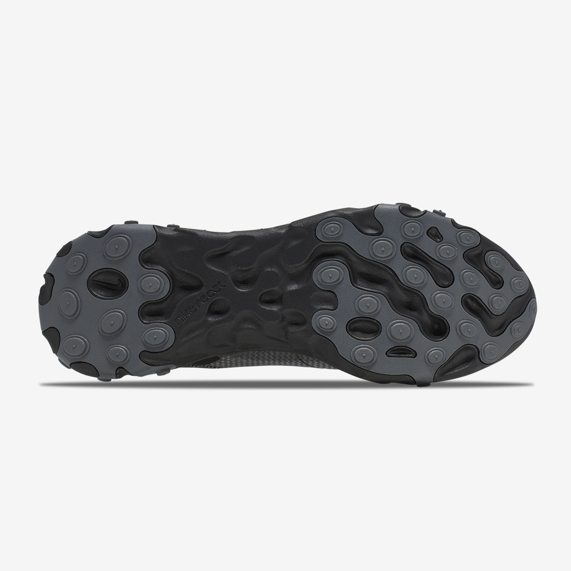 Deze React Element 55 heeft een upper van textiel dat is geconstrueerd in plaats van doorschijnend. Deze colorway heeft een donkergrijze upper met zwarte details op het vetersysteem, de swoosh, de upper en de zachte React-zool.