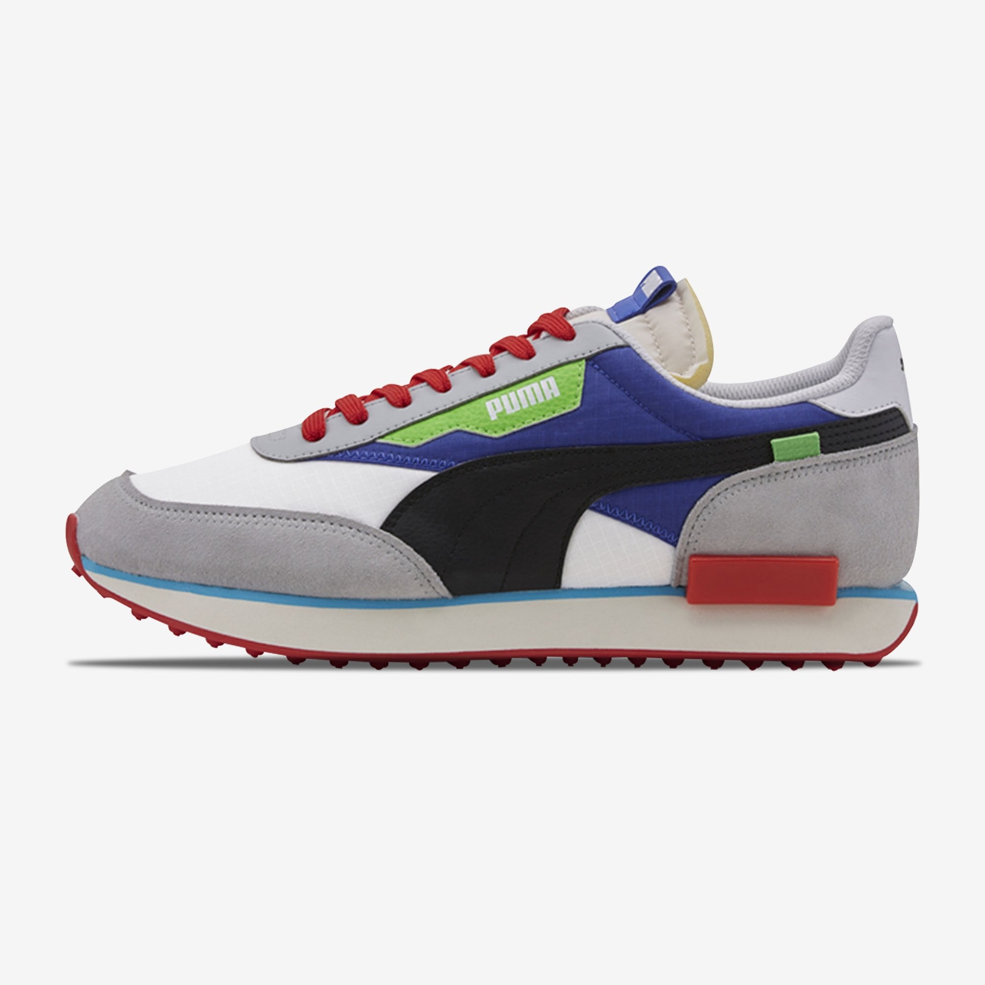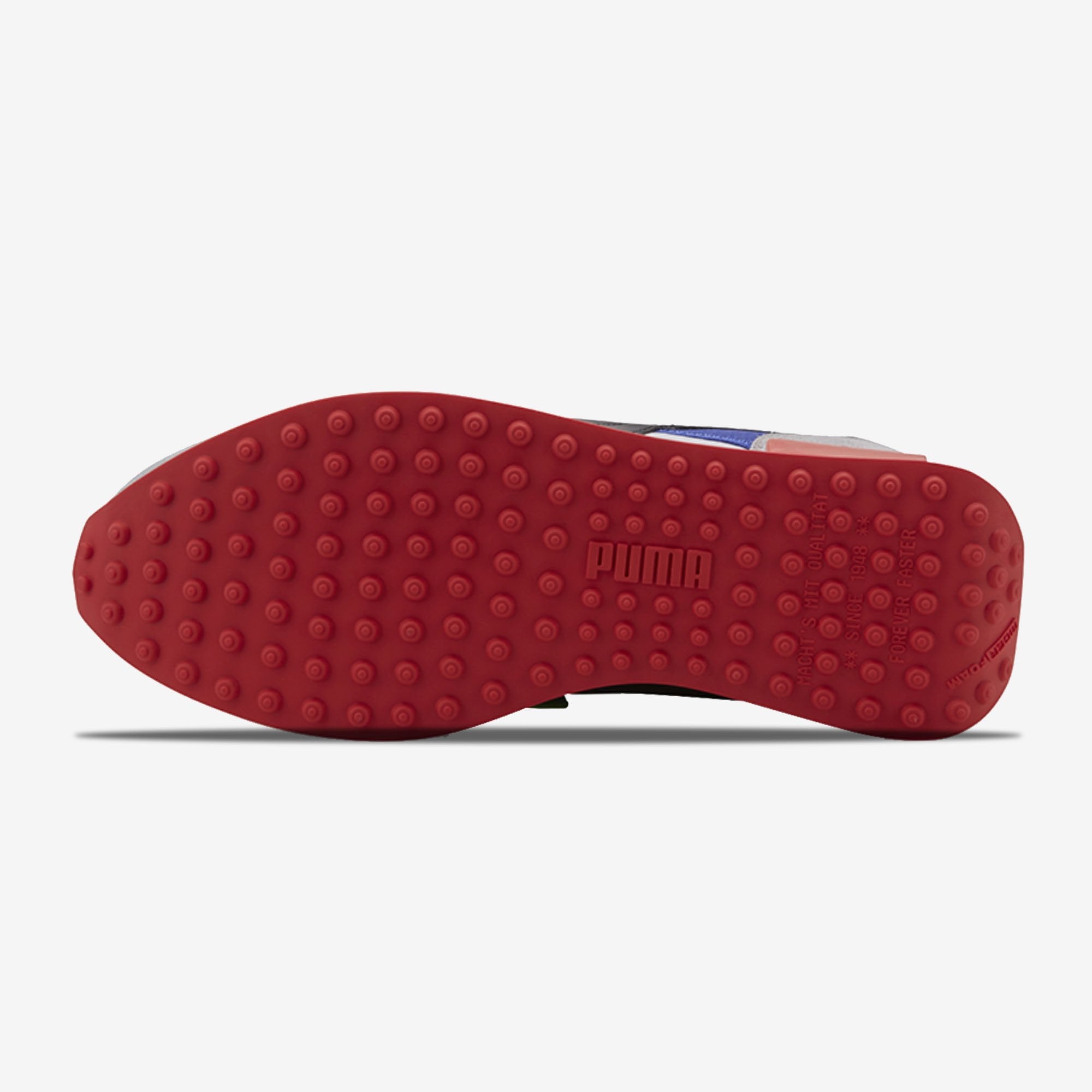 De nieuwe Puma Rider Ride On heeft een wit met blauwe mesh basis met grijze suède panelen en veel rode en blauwe details. De sneaker heeft een rode outsole met ronde uitsteeksels.